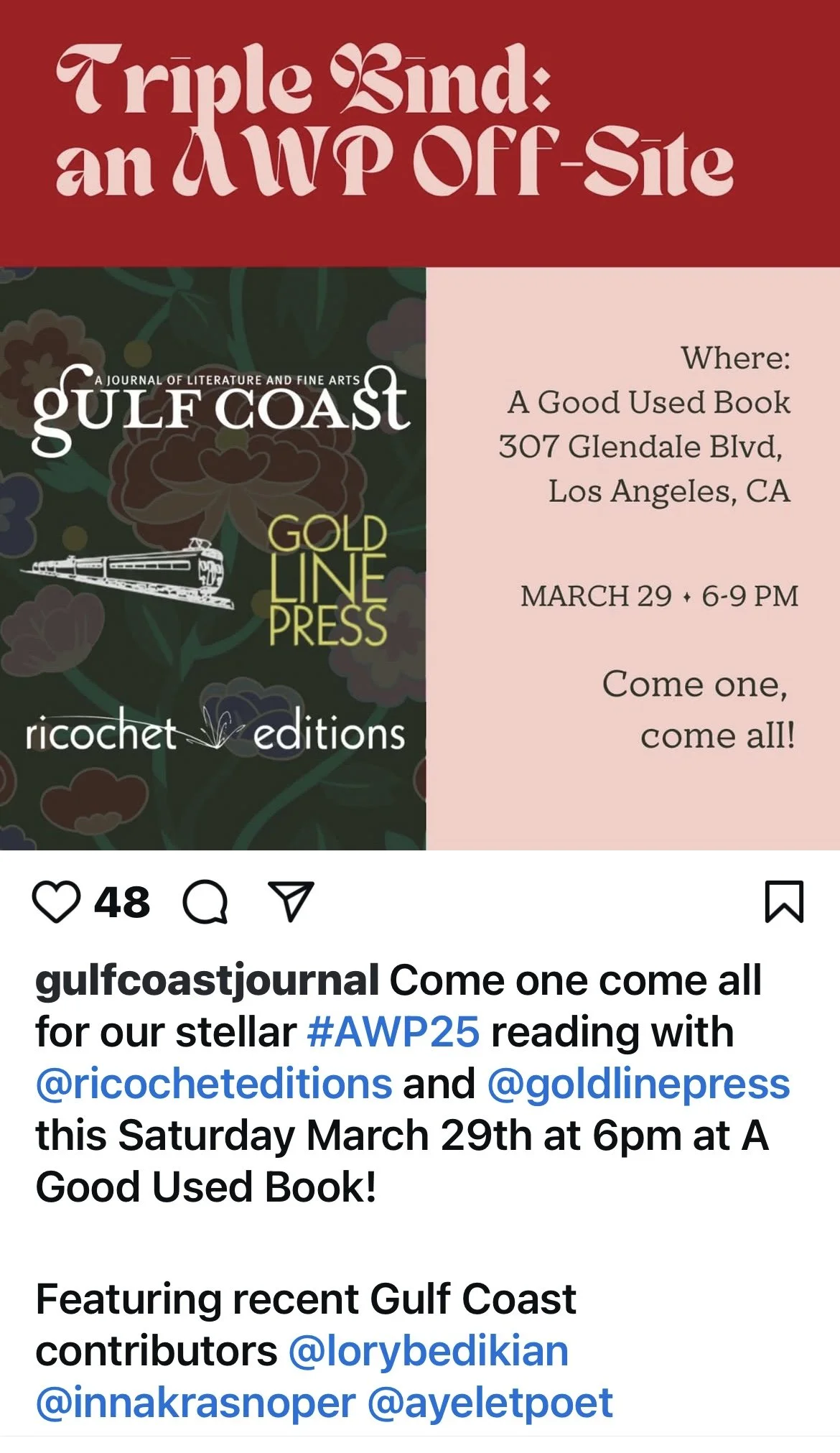 March 29, 6-9 PM, AWP Off Site Reading | Presented by Gulf Coast Lit Mag, Gold Line Press and Ricochet Editions | TRIPLE BIND: an AWP Off-Site | A Good Used Book | Los Angeles, CA